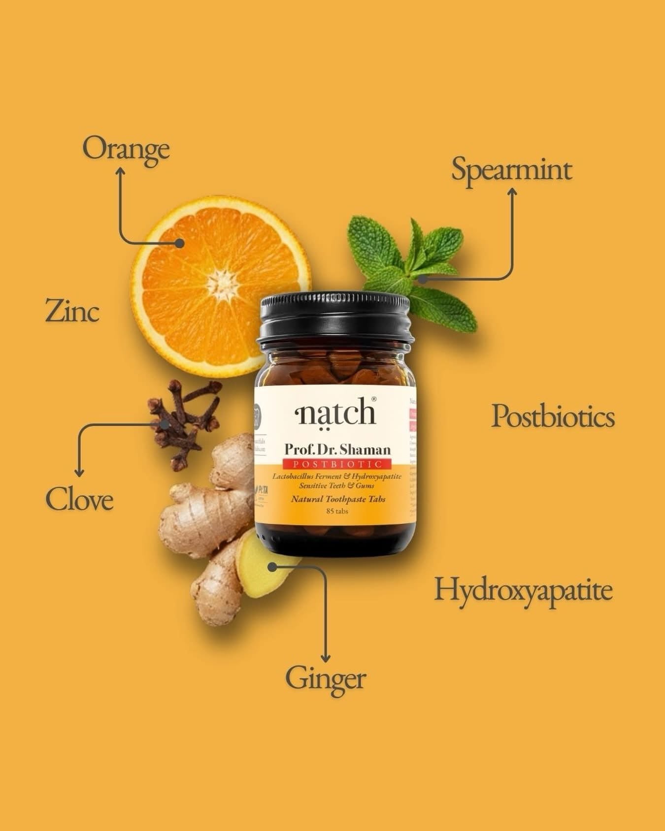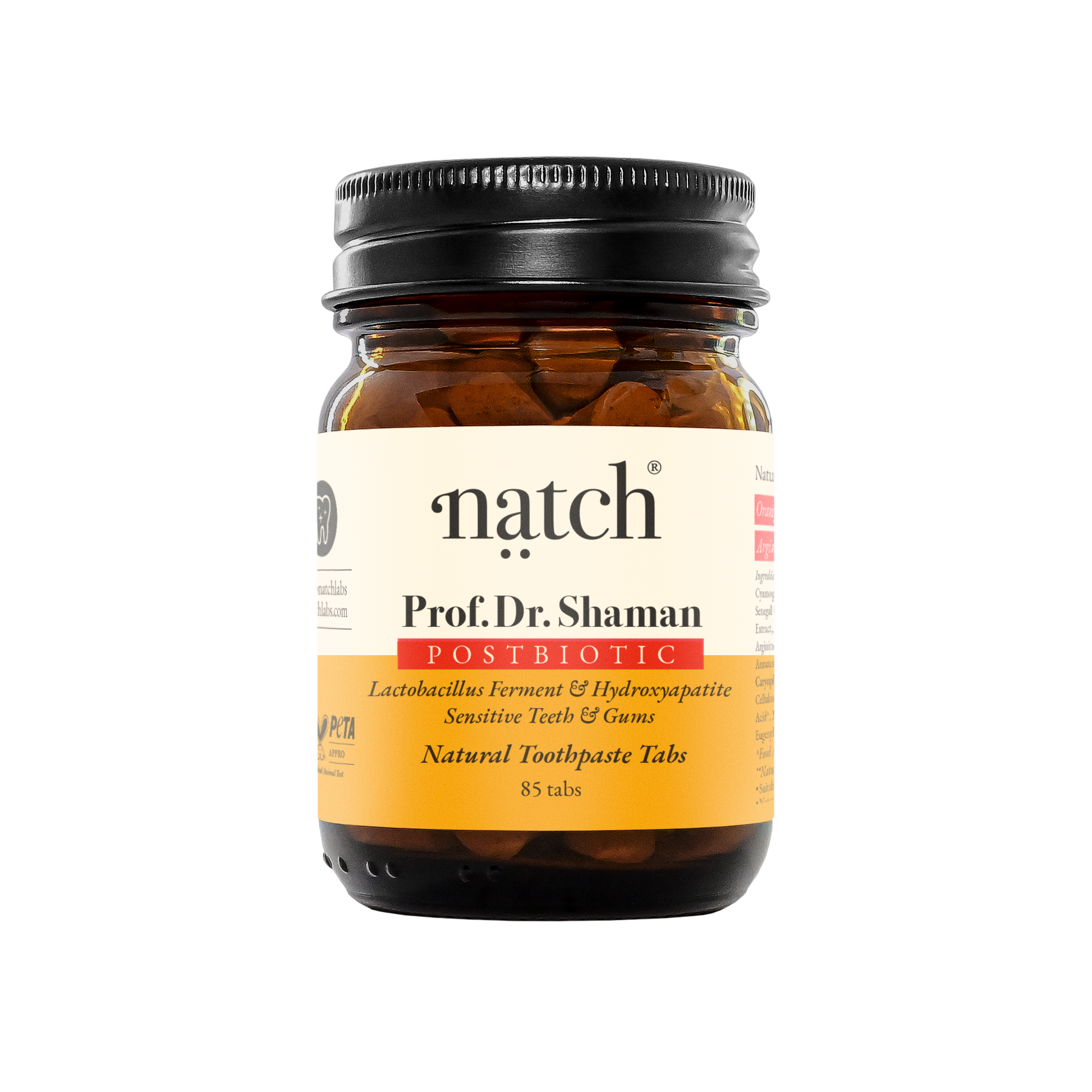 Fyrir viðkvæmar tennur, ójafnvægi í munnflórunni og tannholdsvandamál: Prof. Dr. Shaman Postbiotic er háþróaðasta formúlan frá Natch með nýstárlegum forgerlum, hýdroxýapatíti, sinki, arginine, negul, engifer,appelsínu og myntu. tannholdsvandamál. Stuðlar að heilbrigðri munnflóru.