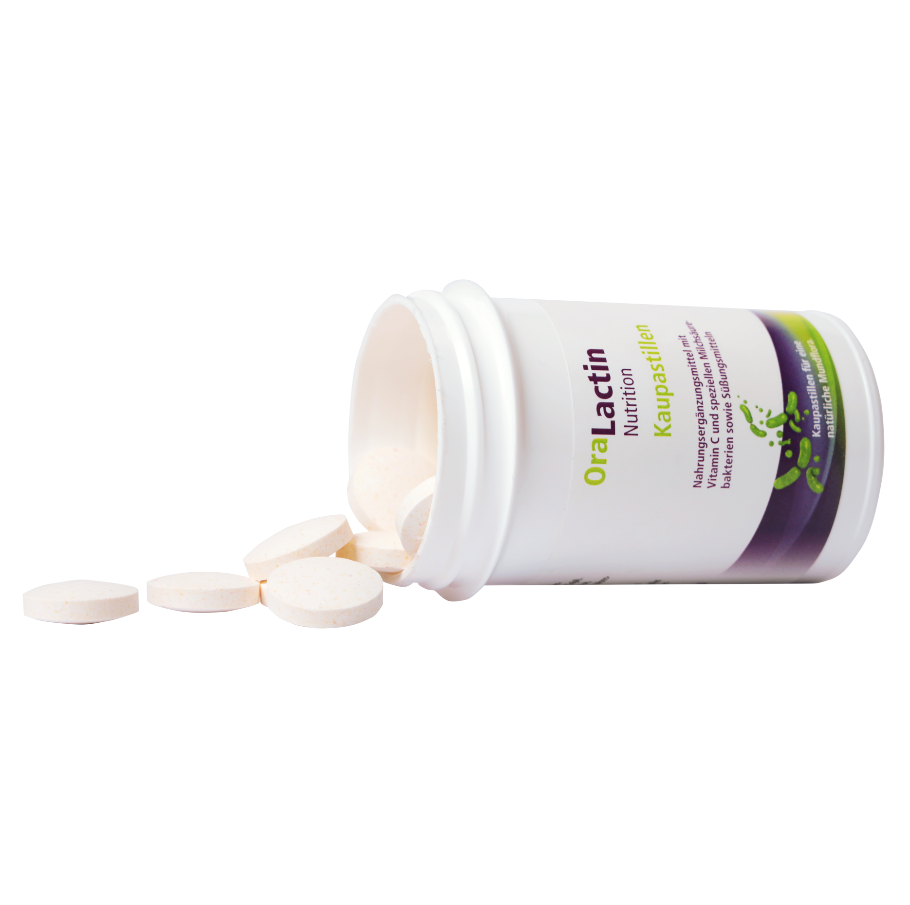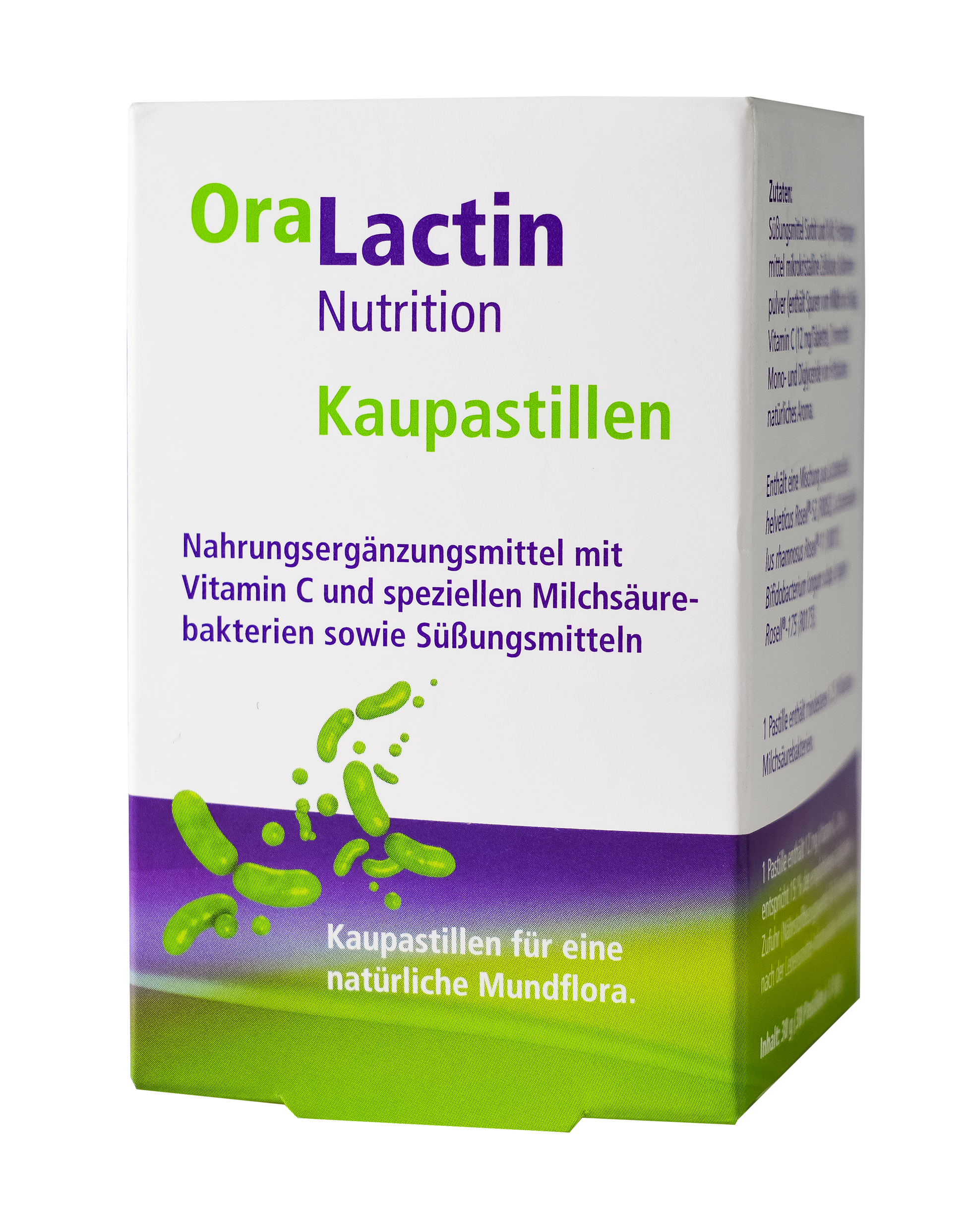 OraLactin tyggitöflurnar innihalda 3 tegundir lifandi góðgerla (Oralis cultures) og C-vítamín. Góðgerlanrir hjálpa til við að byggja upp og viðhalda heilbrigðri munnflóru. Þeir styrkja varnarkerfi munnsins, draga úr andremmu og styðja við tannhold og glerung – sérstaklega áður, á meðan eða eftir meðferð við tannskemmdum, bólgum í tannholdi, tannsteini eða eftir tannhreinsun.